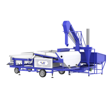The 5XF-2000 Air-screen Cleaner is a multi-purpose machinewith a pre-cleaning and sorting unit for mainly com!ercial cropsThe operation of the machine is divided into two parts. in the firsrials falscreening system with gravity separator, theonto the screen, then blight seeds are teccentrishaft generated by the positive air pressure. Desired materialand larger impurities are moved forward to the topLarger impurities are discharged from thelersizecontaminants and soil in materials fall by the next screen, whilethe desired materials continue to move forward. Finally, all of thegood materials are sorted into specific sizes,i.e, large, mediunand small sizes by grading screenss. The cleaning system ha!elastic balls moving for preventing screen blockages. Thisproduct is the most sensitive screening and cleaning equipmenwith gravity separator and vibrating grader. Moreover, thisproduct is equipped with its own for transferring materials to theair screen cleaner, the materials are passed through the screerand cyclone that are attached to the elevator