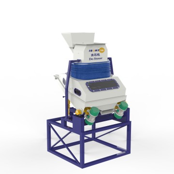 The TQSX-125 Grain De-stoner is designed to effectively removof stones and iron, dirt, glass and other heavy materials fromcrops, such as sunflower seeds, watermelon seeds, kernelswheat and beans, etc. The materials pass through an inclinedoscillating fish scale screen. Materials and high density waste arseparated by means of an upward air blown by a fan. The heav)materials (stones) fall through the air streard are dischargecfrom stone outlet. Suspended particles then sink down to theoutlet. Airflow and angle can be adjusted to achieve an optimaleparation according for different materials. In addition, theexcellent removal of high-density impurities like stones protectsthe downstream processing equipment, significantly reducing itswear and tear. lt is the regular capacity of pre-cleaning machinfor seed hulling, and the refine screening steps for seed sortingine, which is economic and indispensable selection machine fosunflower seed processing industry.