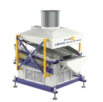 The Gravity De-Stoner is based on the differencebetween the specific gravity of the material and airflowwhich is able to efficiently separate stones, metals, glas.and other high-density impurities in the grain. In processthe tilting and reciprocating motion of the screremovethe stones to the stone outlet, due to the high specifigravity of the impurities, which are less affected by the astream, And the finished materials which are lighteer thathe impurities, are suspended by the air stream anccarried towardESCRIPTION. The equipment can beadjusted by vibration frequency and air volume toachieve efficient separation for different kinds omaterials such as seeds, beans, wheat, spicess. etc. Thismodel has a large processing capacity, high separationaccuracy and is equipped with a dust cover, which caeffectively protect the working environment and servicelife of downstream equipment in the production line